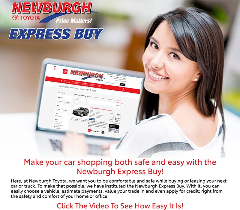 Step one: Choose your next vehicle from the wide selection atĀ www.newburghtoyota.com. Click on the "Newburgh Express Buy" button to start the process. Choose "purchase" or "lease", select your desired term, rate and down payment and the